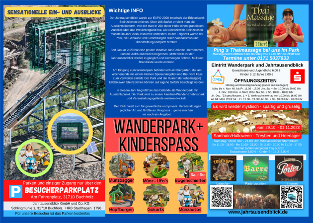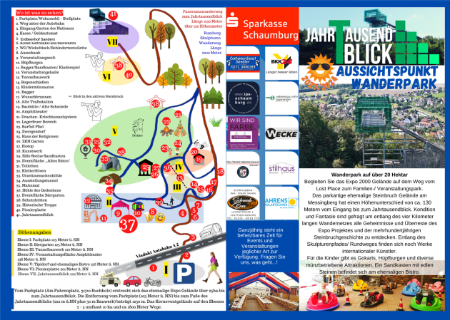 Was ist wo? Was ist noch übrig von dem Expo 2000 Park Erlebniswelt Steinzeichen? Wo sind die Wege? Habe ich alles gesehen? Wie hoch bin ich gerade? Wie weit ist es bis zum Jahrtausendblick? Fragen, die uns die Besucher immer wieder stellen. Mit diesem Plan versuchen wir Euch einen kleinen Überblick zu verschaffen und Eure Entdecker Tour zu unterstützen.